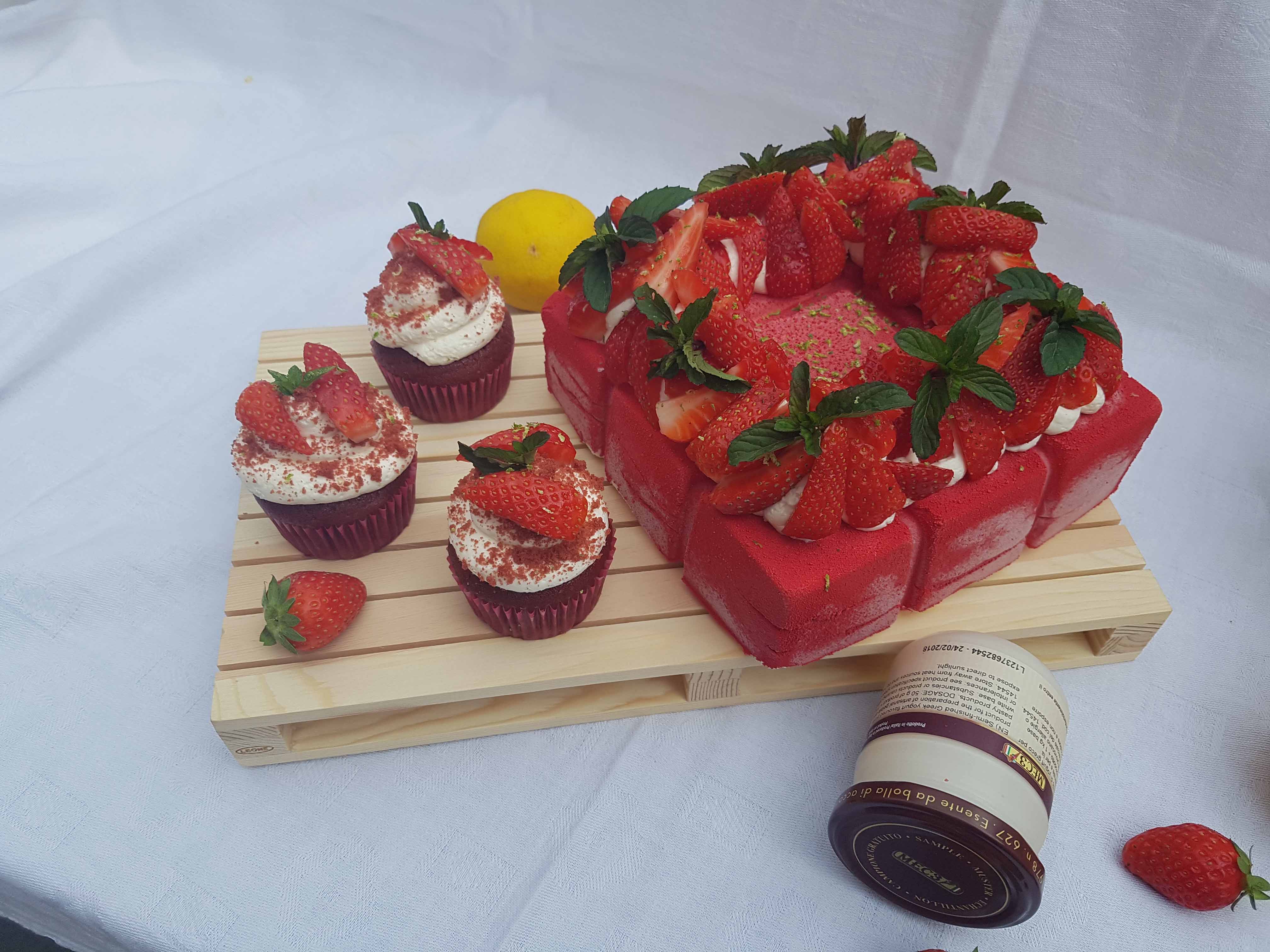 CUP CAKES Riempire un sac a poche con bocchetta liscia con la crema e formare un ricciolo di crema sui cup cakes e decorare con briciole di red velvet, frutta tagliata a piccoli pezzi e buccia di limone grattugiata.